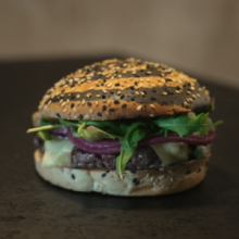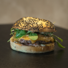Bun’s noir, bœuf boucher VBF, Fromage de chévre, lard grillé, oignon Frits, roquette et sauce a l’ancienne. TOUS NOS BURGERS SONT DISPONIBLES EN VERSION VÉGÉTARIEN ET SANS PORC.