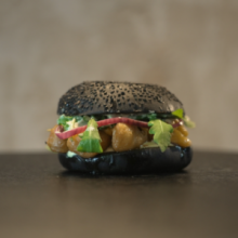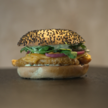 Bun’s noir, filet de colin pané, cheddar affiné, lard grillé Pickles d’oignon rouge,et sauce aux herbes. TOUS NOS BURGERS SONT DISPONIBLES EN VERSION VÉGÉTARIEN ET SANS PORC.