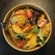 Bun’s, filet de poulet VF pané, Cheddar affiné, lard grillé, pickles oignons rouges, roquette et sauce aux herbes. TOUS NOS BURGERS SONT DISPONIBLES EN VERSION VÉGÉTARIEN ET SANS PORC.